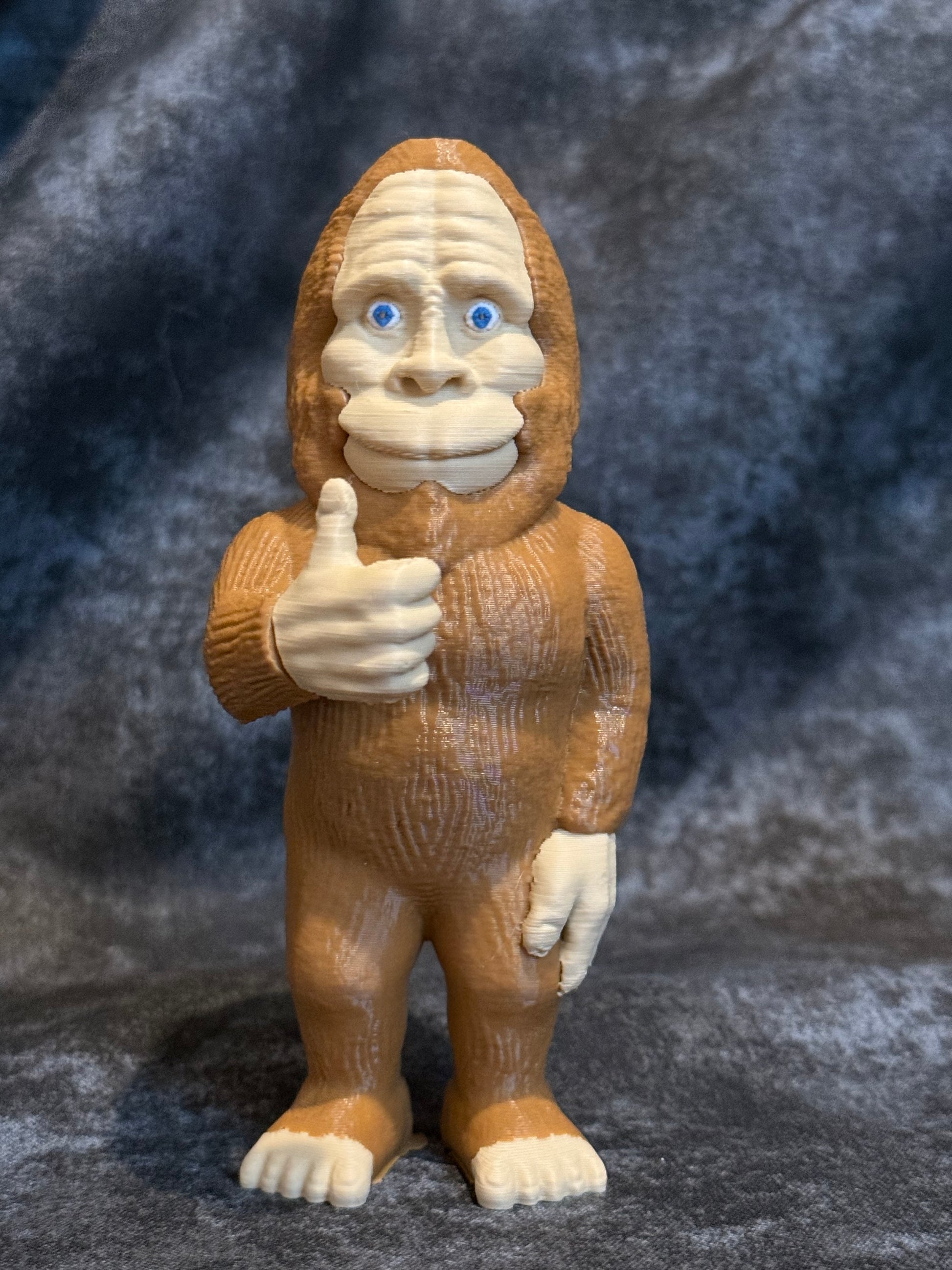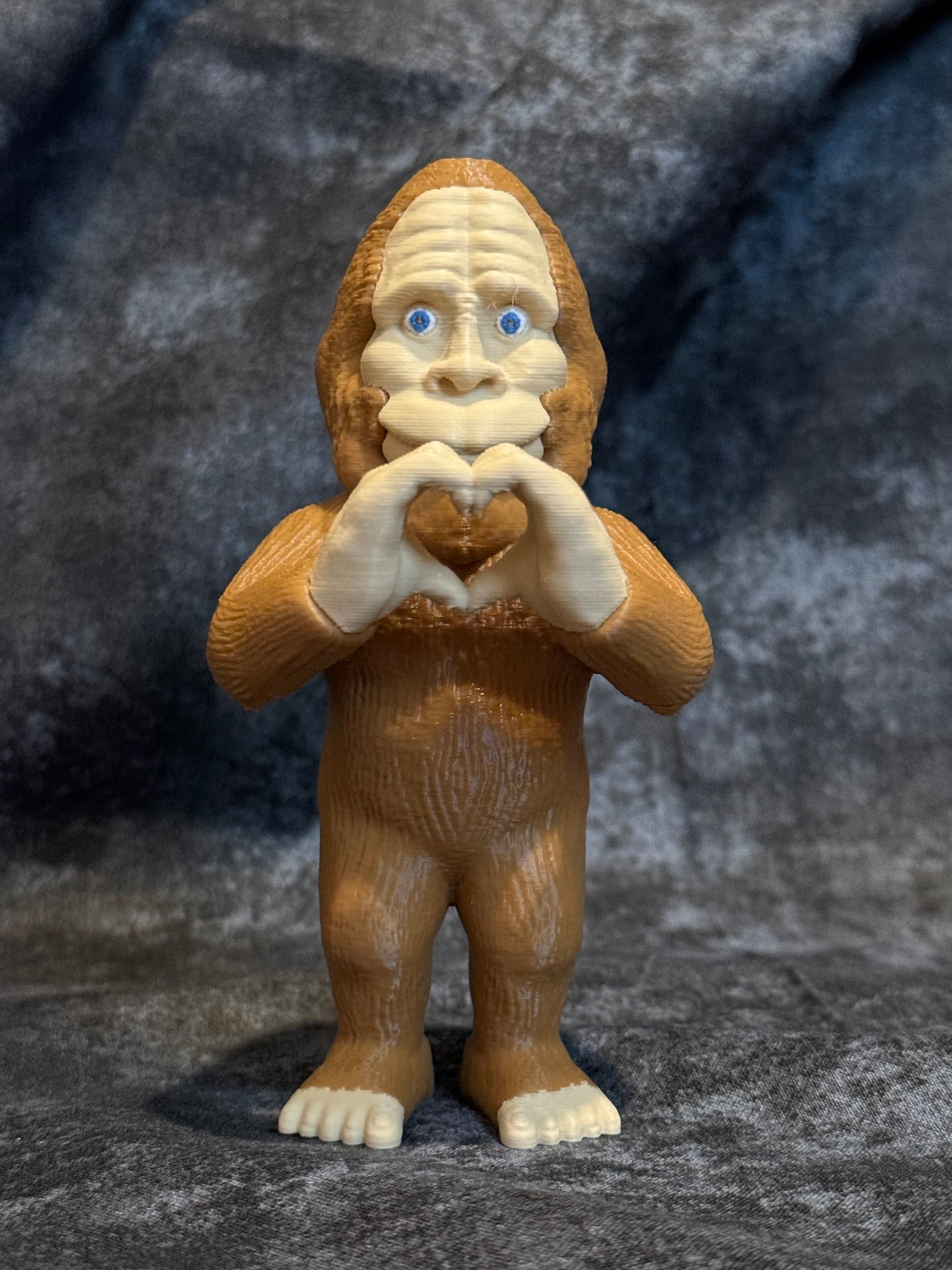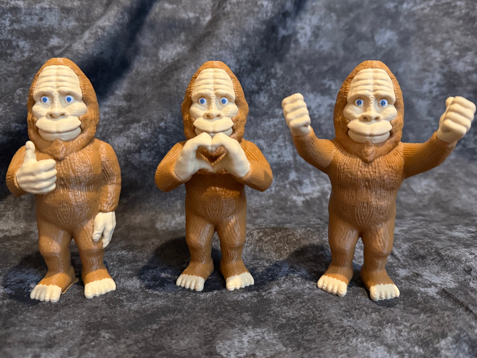 Bring a little joy and mystery into your space with our Friendly Bigfoot Figurine Set! These charming 3D-printed Bigfoots come in three expressive poses: a cheerful thumbs-up, a heartfelt hand heart, and a victorious double fist pump. Each figure is crafted with detailed texture, bright blue eyes, and a playful spirit that’s perfect for desktops, shelves, or as a unique gift.